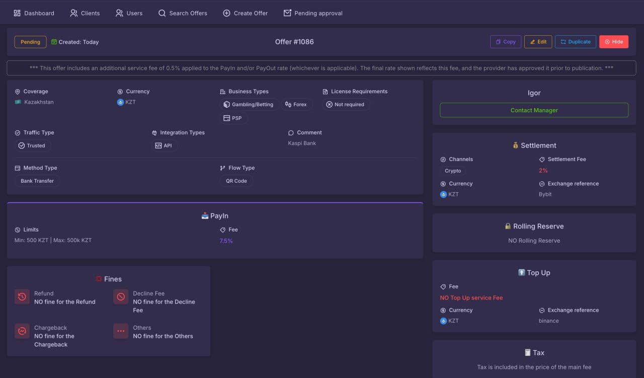 🇰🇿 Offer for QR ecom Kaspi Trusted + Withdrawals ✅ For iGaming merchants ✅ We can review forex and PSPs 🟢 Deposit – 7,5% from ₸500 to ₸500 000 🟢 P2P Withdrawals – 1,6% from ₸500 to ₸500 000 🔼 Settlement USDT Bybit 2% T+3 Contact: @mylifediane_PHR